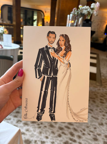 How does a Wedding Illustrator work? Throughout the day I will be set up either at one desk or multiple depending on if the venue changes throughout. I will draw the guests either live or from specifically requested photographs taking approximately 7-10 minutes per solo illustration or 12 minutes for couples. This service works particularly well during the pre dinner, and the drinks reception. I am capable to work either live or from photos, allowing me to provide you the most value possible in the hired time, without drawing guests away from the other festivities.